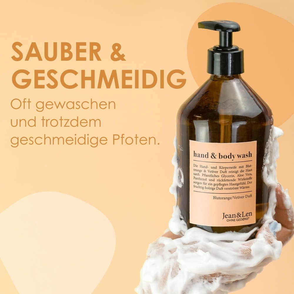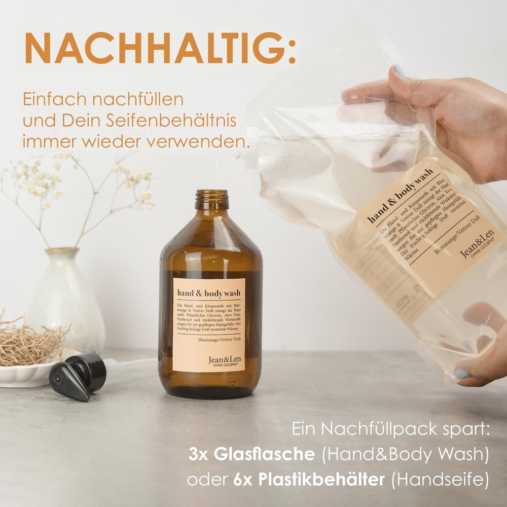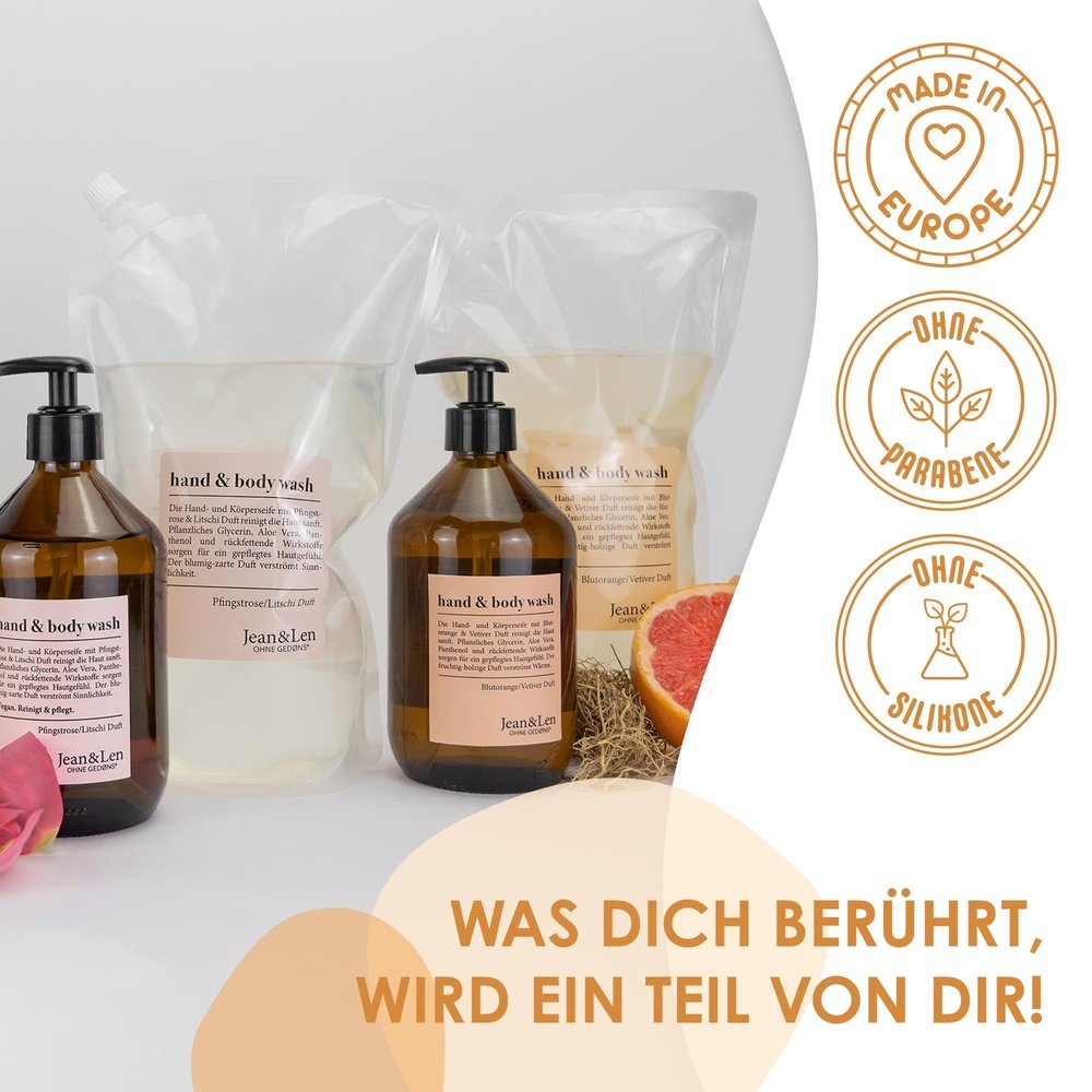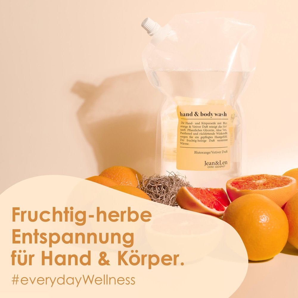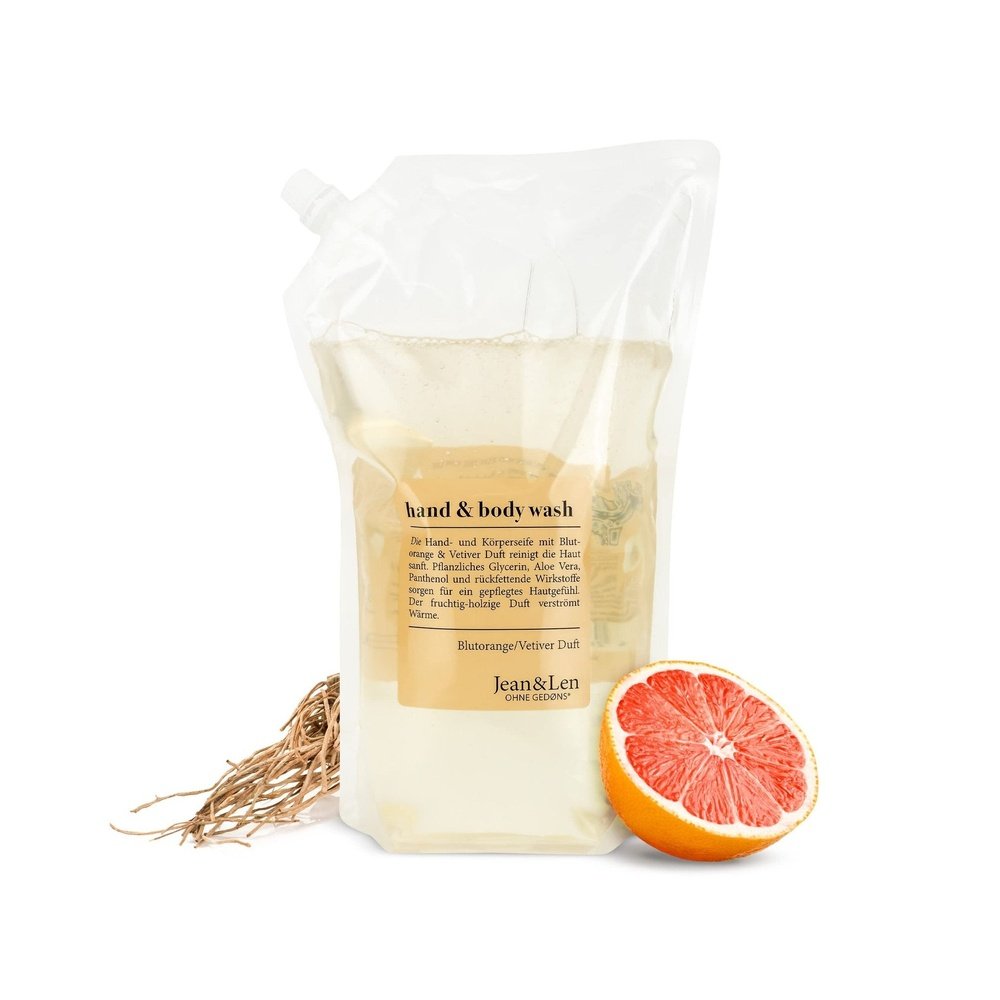 - Lieferumfang: 1 x 1,5L Jean&Len Hand & Body Wash Blutorange und Vetiver, reinigt und pflegt die Haut beim Waschen, fruchtig-holziger Duft, Flüssigseife im Nachfüllpack, ohne Parabene & Silikone, vegan