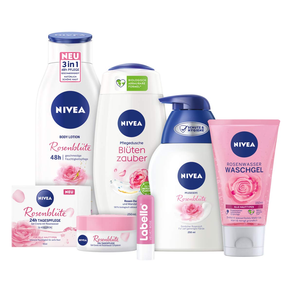 • Verwöhnendes Set – Das NIVEA Smell of Roses Geschenkset pflegt die Haut mit Waschgel, Gel-Creme Tagespflege, Pflegeseife, Pflegedusche, Body Lotion und Labello.